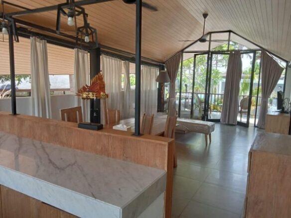 Villa berdiri di atas lahan 160 m² dengan luas bangunan 110 m² dan dirancang dalam satu lantai yang fungsional. Properti ini memiliki 3 kamar tidur dan 3 kamar mandi, ruang tamu yang luas dan nyaman, dapur modern, serta private swimming pool berukuran 3 x 7 meter yang memberikan suasana resort pribadi bagi penghuni. Area parkir tersedia untuk 1 mobil dan 2 motor dengan akses jalan selebar 5 meter sehingga memudahkan mobilitas kendaraan. Villa dijual dalam kondisi fully furnished sehingga siap langsung ditempati atau disewakan.