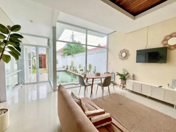 Villa ini memiliki tiga kamar tidur yang masing-masing dilengkapi pendingin udara (AC) dan tiga kamar mandi pribadi untuk menjamin kenyamanan maksimal. Area ruang tamu mengusung konsep enclosed living yang dilengkapi AC dan tirai, memberikan fleksibilitas bagi Anda untuk menikmati suasana privat yang sejuk di tengah cuaca tropis Bali. Seluruh sudut ruangan hadir dalam kondisi fully furnished, lengkap dengan dapur modern yang memiliki peralatan masak standar tinggi, siap digunakan tanpa perlu biaya tambahan untuk pengisian furnitur.