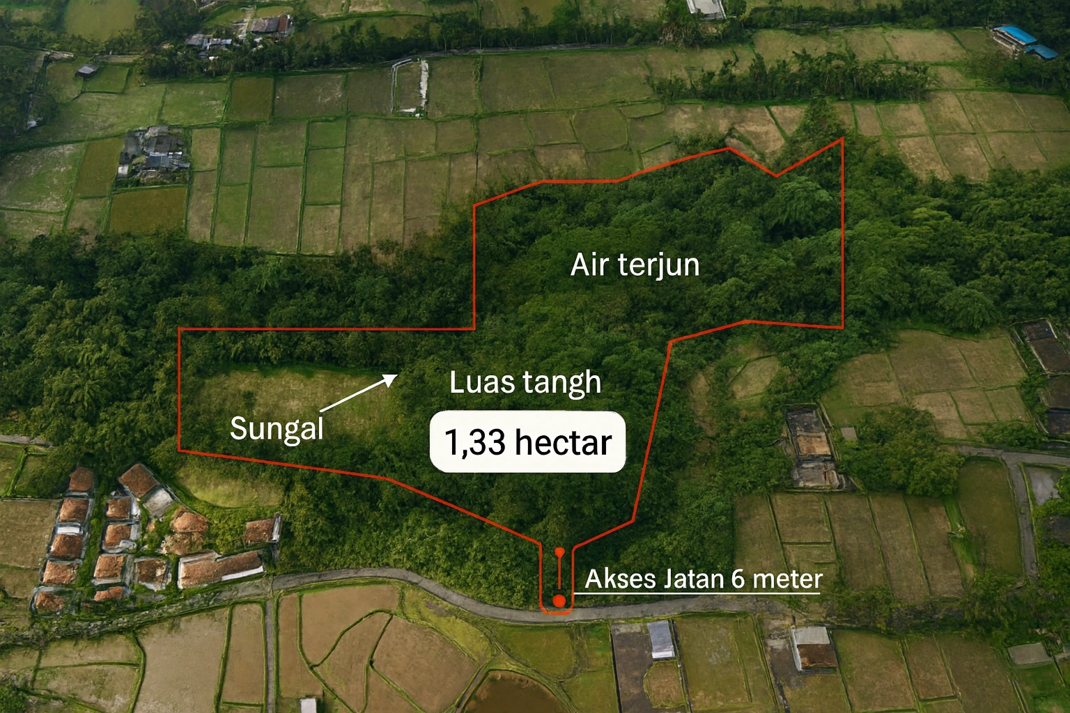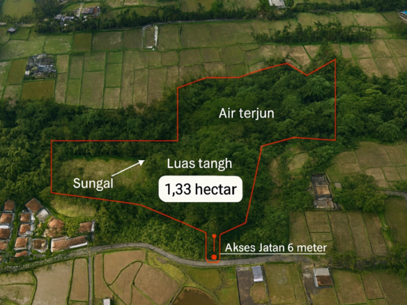Miliki mahakarya alam seluas 13.300 m² (1,33 Hektar) di kawasan Ubud, sebuah properti yang menawarkan eksklusivitas tiada banding. Lahan ini bukan sekadar tanah kosong; ia adalah sebuah ekosistem yang matang, terletak di atas bukit yang menyajikan pemandangan sawah membentang serta berbatasan langsung dengan aliran sungai (los sungai). Properti ini merupakan jawaban bagi investor yang ingin membangun destinasi luxury retreat atau kompleks villa dengan konsep slow living yang autentik di Bali.