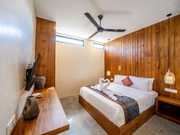 Properti ini memiliki 2 kamar tidur yang dilengkapi kamar mandi dalam, menggunakan tempat tidur ukuran king serta pendingin ruangan untuk kenyamanan maksimal. Setiap kamar dirancang dengan pencahayaan alami yang baik sehingga memberikan suasana yang hangat dan nyaman.