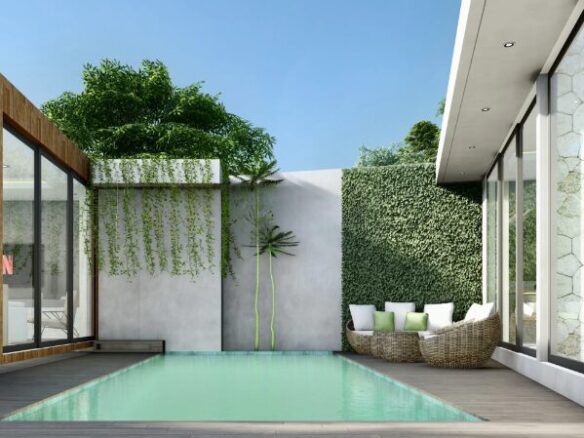 Interior villa dirancang modern dan nyaman dengan konsep ruang tamu serta dapur terbuka dan tertutup. Area luar dilengkapi kolam renang pribadi, taman hijau, dan kolam koi yang menciptakan suasana tenang untuk relaksasi. Unit ini dijual fully furnished dengan fasilitas penunjang seperti AC, TV, ruang gym, dan area kantor, sehingga siap digunakan tanpa biaya tambahan besar.